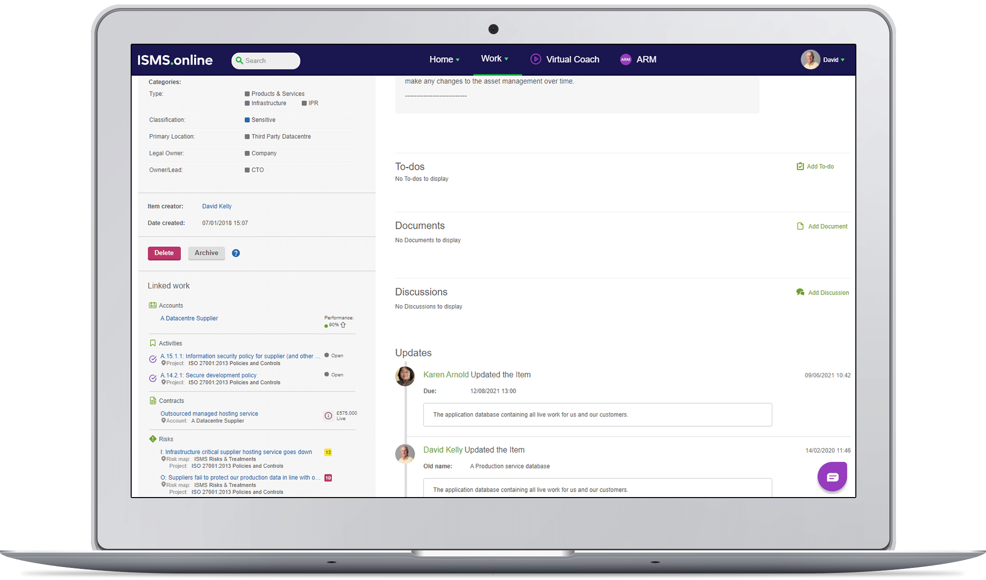 Finally, the best tools will come with the ability to easily link the asset to risks on your risk treatment plan, to your ISMS controls, supply chain and any other actions in the ISMS that demonstrate your assets are well protected.